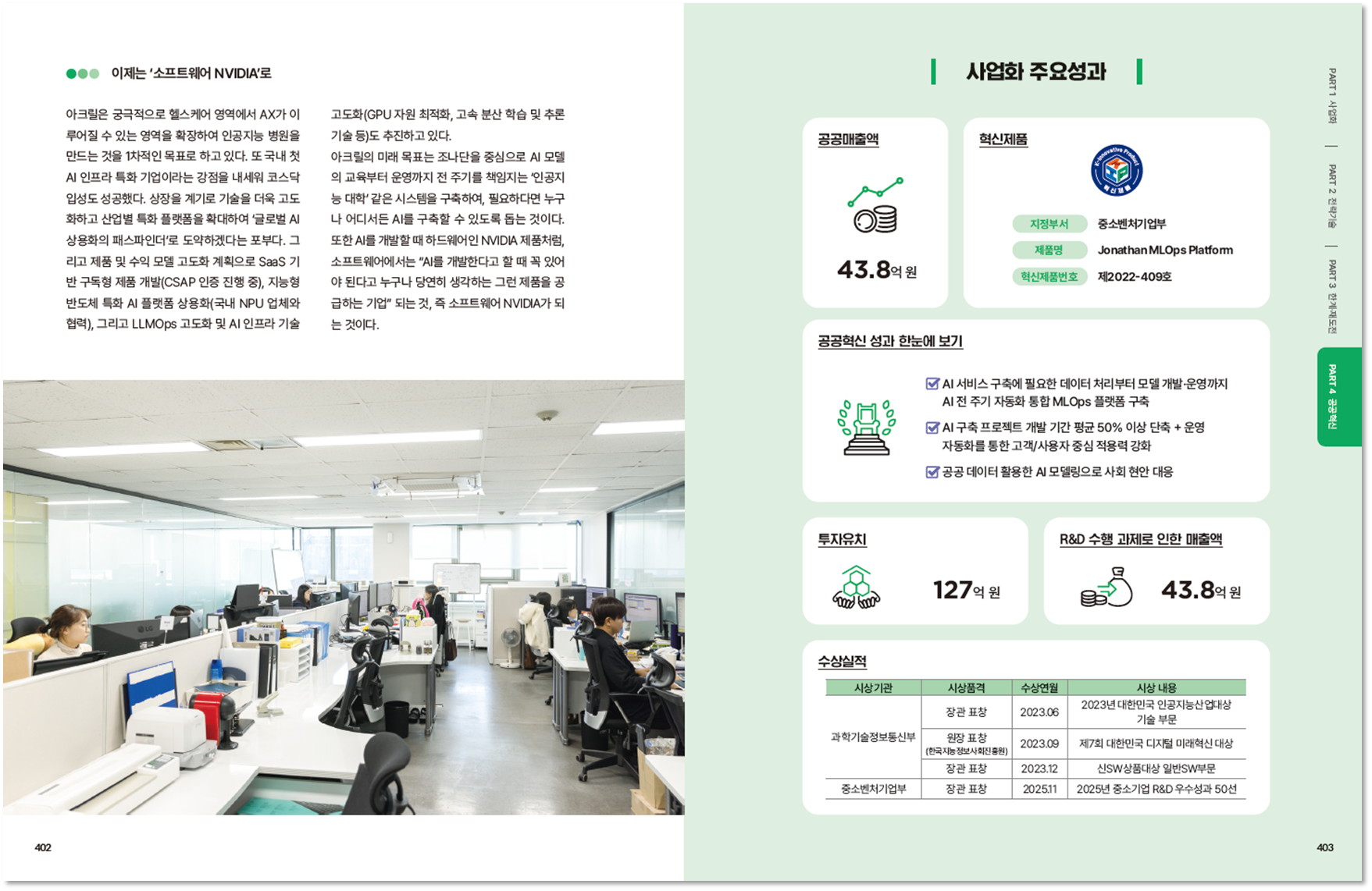 주식회사 아크릴이 중소벤처기업부가 선정하는 '2025 중소기업 R&D 우수성과 50선'에 이름을 올렸다. 아크릴은 2016년 중소기업기술혁신개발사업을 통해 AI 개발 솔루션 '플라이트베이스'를 개발한 이후, 이를 지속적으로 고도화하여 데이터 처리부터 모델 개발·운영까지 AI 전 주기를 자동화하는 통합 MLOps 플랫폼 '조나단 플라이트베이스(Jonathan FlightBase)'로 발전시켰다.